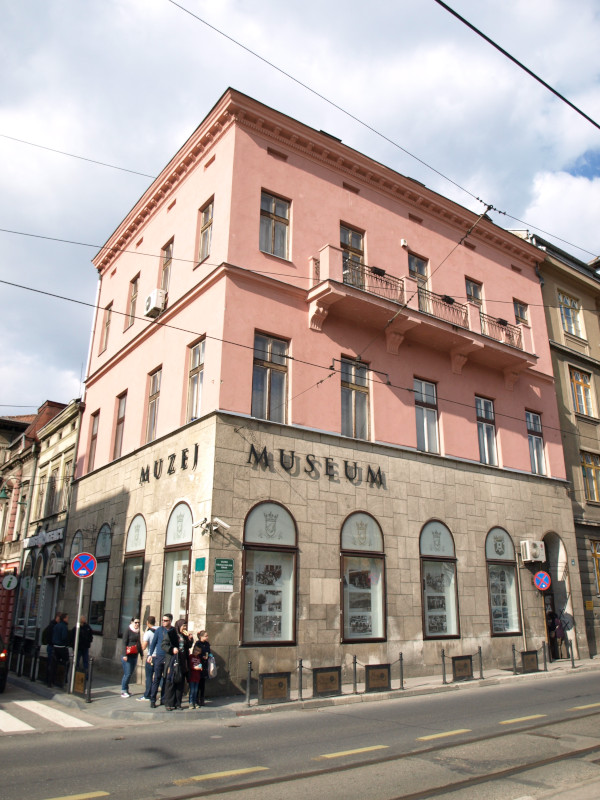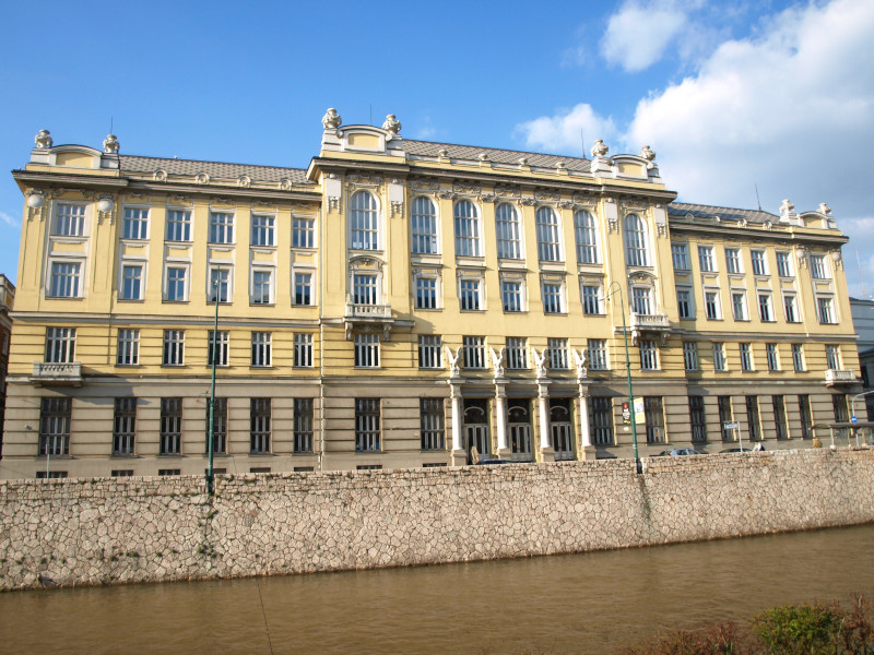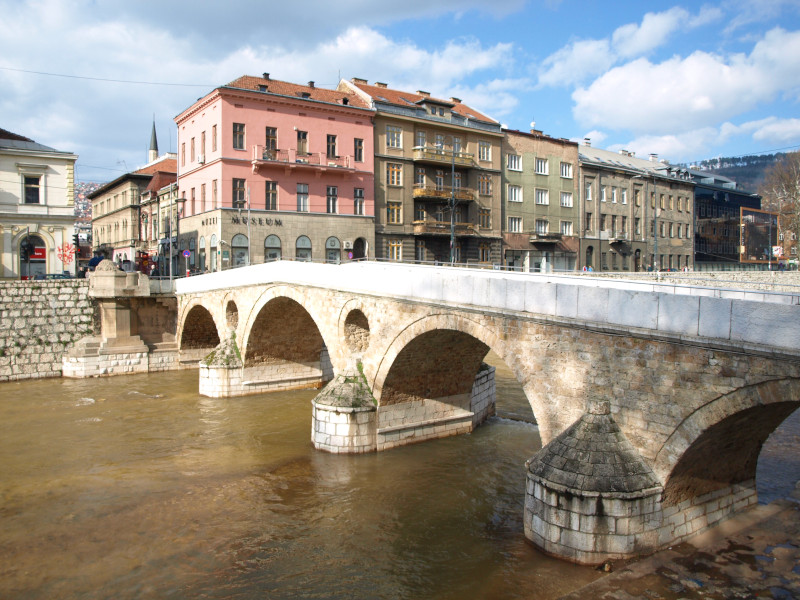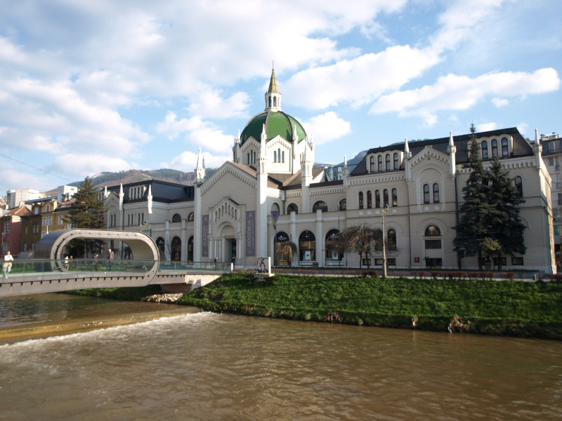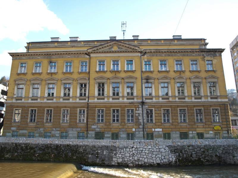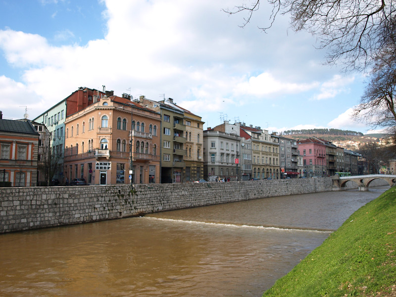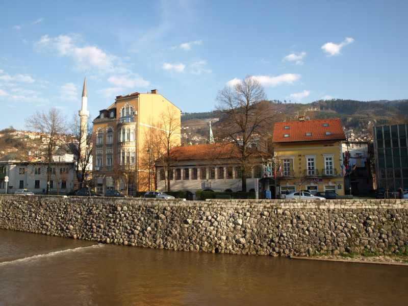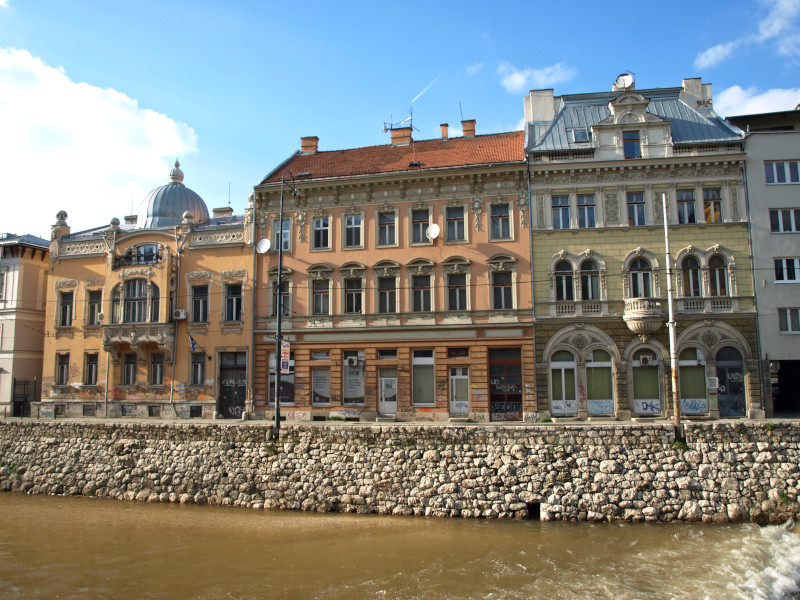 Was: Lateinerbrücke (Bj. 1565, Ort des Attentats vom 28. Juni 1914), Museum „Sarajevo 1878-1918“, Altes Rathaus (Bj. 1892-1894), aschkenasische Synagoge (Bj. 1902), Hauptgebäude der Universität (Bj. 1850-er), Privredna Bank (Bj. 1913), Nationaltheater (Bj. 1897-1898 bzw. 1919-1921), Akademie der Künste (Bj. 1898-1899 bzw. 1911), Hauptpost (Bj. 1911-1913), Šeher Ćehaja Brücke (Bj. 1585-1586)