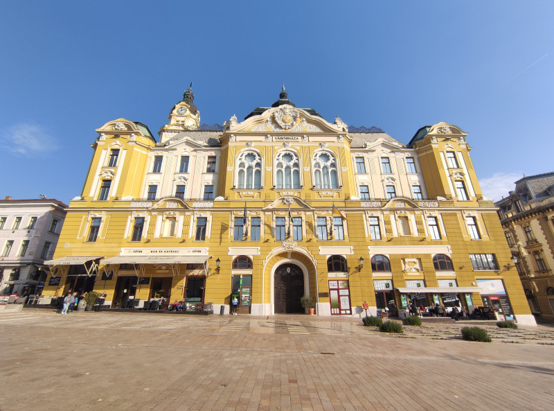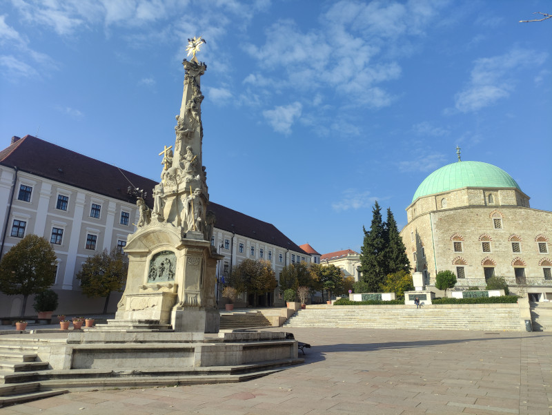 Was: Moschee Gazi Khassim (Bj. 16. Jhd.), Statue der Dreifaltigkeit (1908), Rathaus (Bj. 1907), St. Sebastian (Bj. 1727-1731 bzw. 1887-1891), Baranya Verwaltung (Bj. 1897), János-Hunyadi-Denkmal (1956), Lóránt-Palais (Bj. 1880-er)