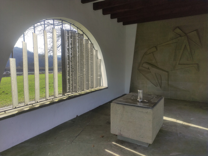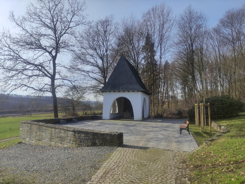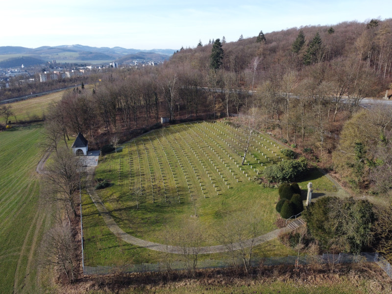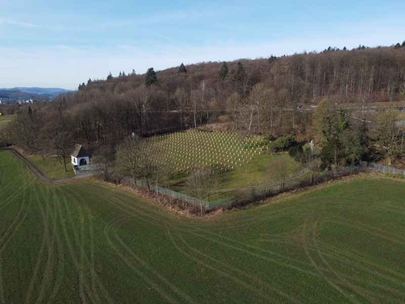 Was: Kriegsgräberanlage Eversberg (1939-1945), Gedenkkapelle mit dem „Fenster der Erinnerung“ (2014)